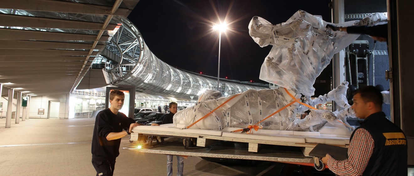 Die über vier Meter hohe und sechs Meter breite Skulptur wiegt mehr als eine Tonne und stellte die Logistiker vor eine Herausforderung. Allein das ungewöhnliche Format verlangte, dass das Kunstwerk auf zwei großen Spezialpaletten transportiert werden musste. Der Logistikspezialist Hasenkamp überwachte und verantwortete den gesamten Transport von China bis nach Deutschland. Vom Seehafen Xingang (rund 180 Kilometer von Peking entfernt) dauerte der Transport auf einem Containerschiff nach Hamburg allein 40 Tage. In Deutschland wurde der Container dann auf einen LKW verladen, der das Kunstwerk über mehrere kleinere Zwischenstopps schlussendlich zum Flughafen Düsseldorf brachte. Ab heute wird die Skulptur auf der Abflugebene des Terminal B aufgebaut und kann ab dem 12. Mai von Flugreisenden in ihrer Gänze bestaunt werden.